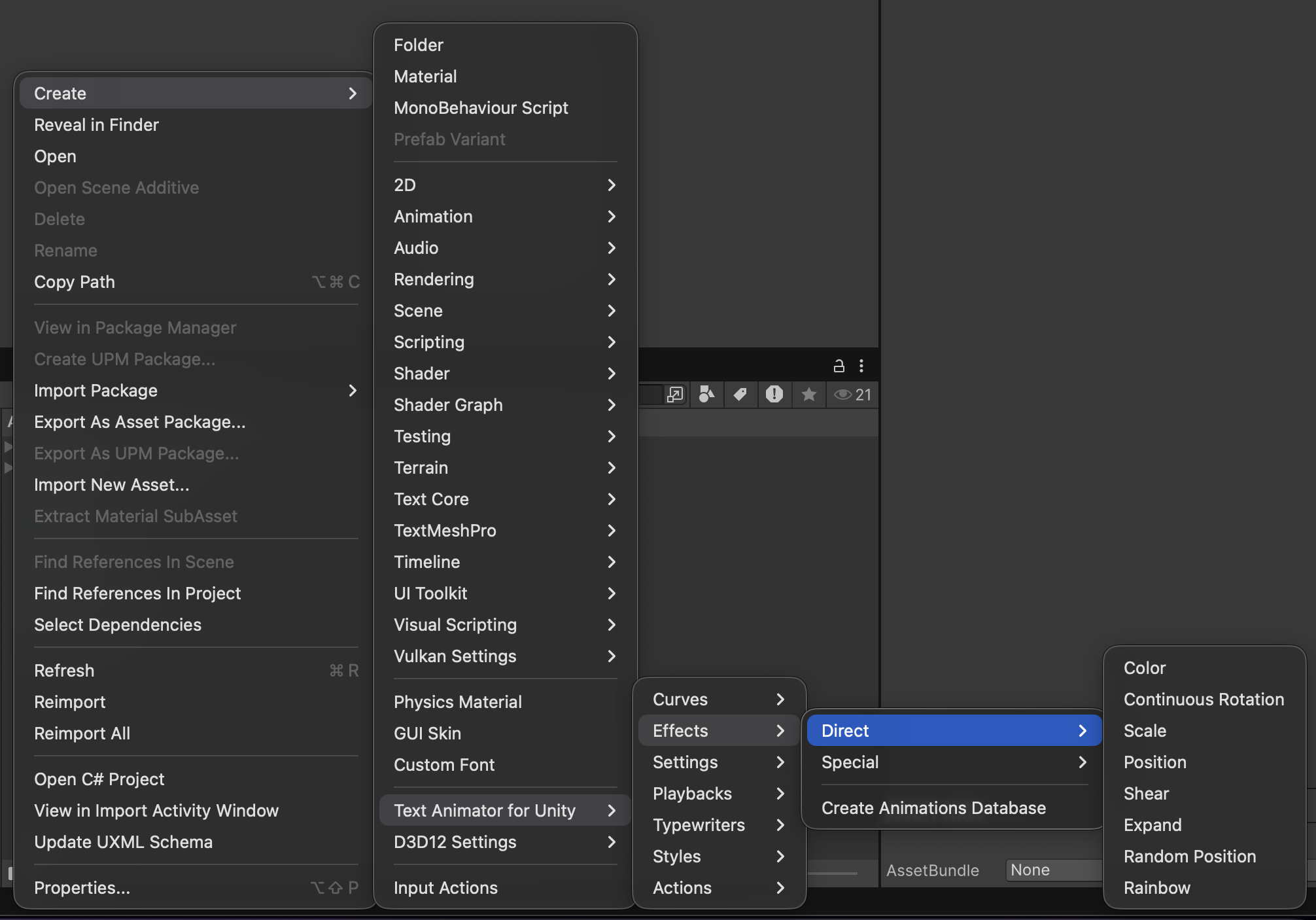 As always, to create a custom effect head over to the Project Window -> Create -> Text Animator for Unity and then select any element from the "Effects" menu.