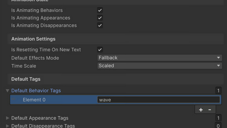 You can decide which effect(s) will be applied to all letters by default, **without having to write effects tags inside your texts** thanks to [animator-settings](https://docs.febucci.com/text-animator-unity/effects/how-to-add-effects/animator-settings "mention").