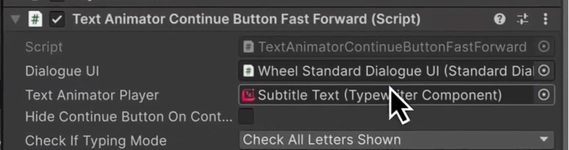 Replace the `Standard UI Continue Button` with the one designed specifically for `Text Animator` by PixelCrushers, called `Text Animator Continue Button Fast Forward`.