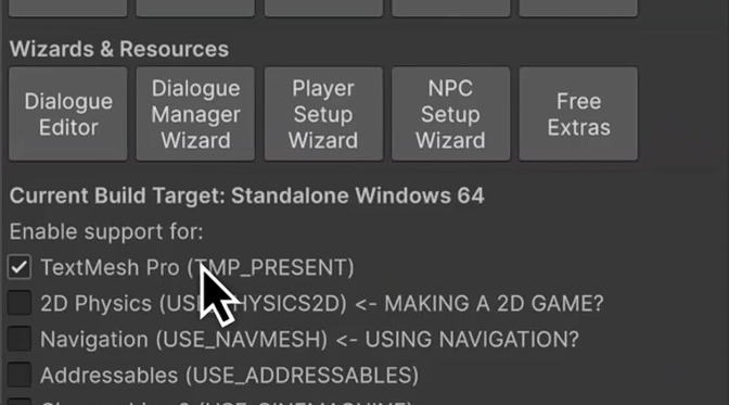 **Step 1.** Make sure TextMeshPro is enabled in Dialogue System for Unity